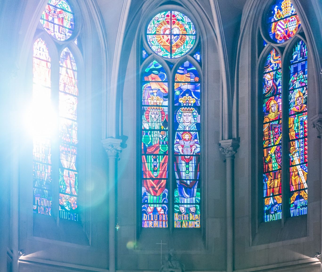 A gauche des vitraux du centre, se trouvent St Michel, prince de la milice céleste et patron de l’archiconfrérie Notre-Dame des Soldats, et Jeanne d’Arc, patronne secondaire de la France. Ils sont entourés par St Louis et Ste Geneviève, patronne de Paris, St Rémi et Ste Clotilde qui ont permis le baptême de la France, St Martin surmonté de sa devise « je ne refuse pas le combat », et St Maurice, soldat martyr, St Georges, patron des cavaliers et Ste Barbe, patronne des arquebusiers et des canonniers.