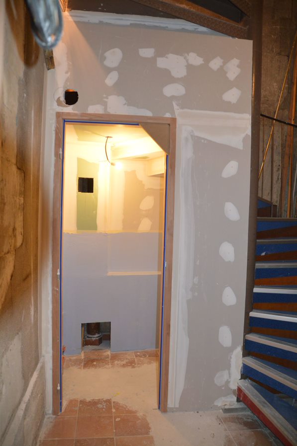 Après la démolition, les entreprises s’attachent à agrandir le couloir existant ; bien vite on voit se dessiner les nouvelles cloisons de ce qui sera bientôt une sacristie, un bureau, des toilettes et la grande salle d’accueil Saint Paul. Les structures de portes sont fixées avec la mise aux normes pour l’accessibilité aux personnes à mobilité réduite. Les câbles de toutes les couleurs courent sur les plafonds. Et la poussière s’infiltre partout nous donnant l’impression d’une neige bien fine sur tout l’escalier de la tribune….
