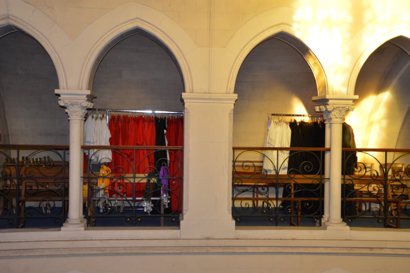 Depuis quelques jours, une nouvelle entreprise s’attaque aux sols, et pose une résine colorée qui doit être couverte de plusieurs couches de vitrification… Entre deux temps de séchage, aucun pied ne peut en fouler le moindre centimètre… Pas d’’échelle de corde pour grimper à la tribune et rejoindre la sacristie temporaire… cela n’aurait pourtant pas déçu les enfants de chœur d’aller se vêtir de leurs soutanelles par la voie des airs !